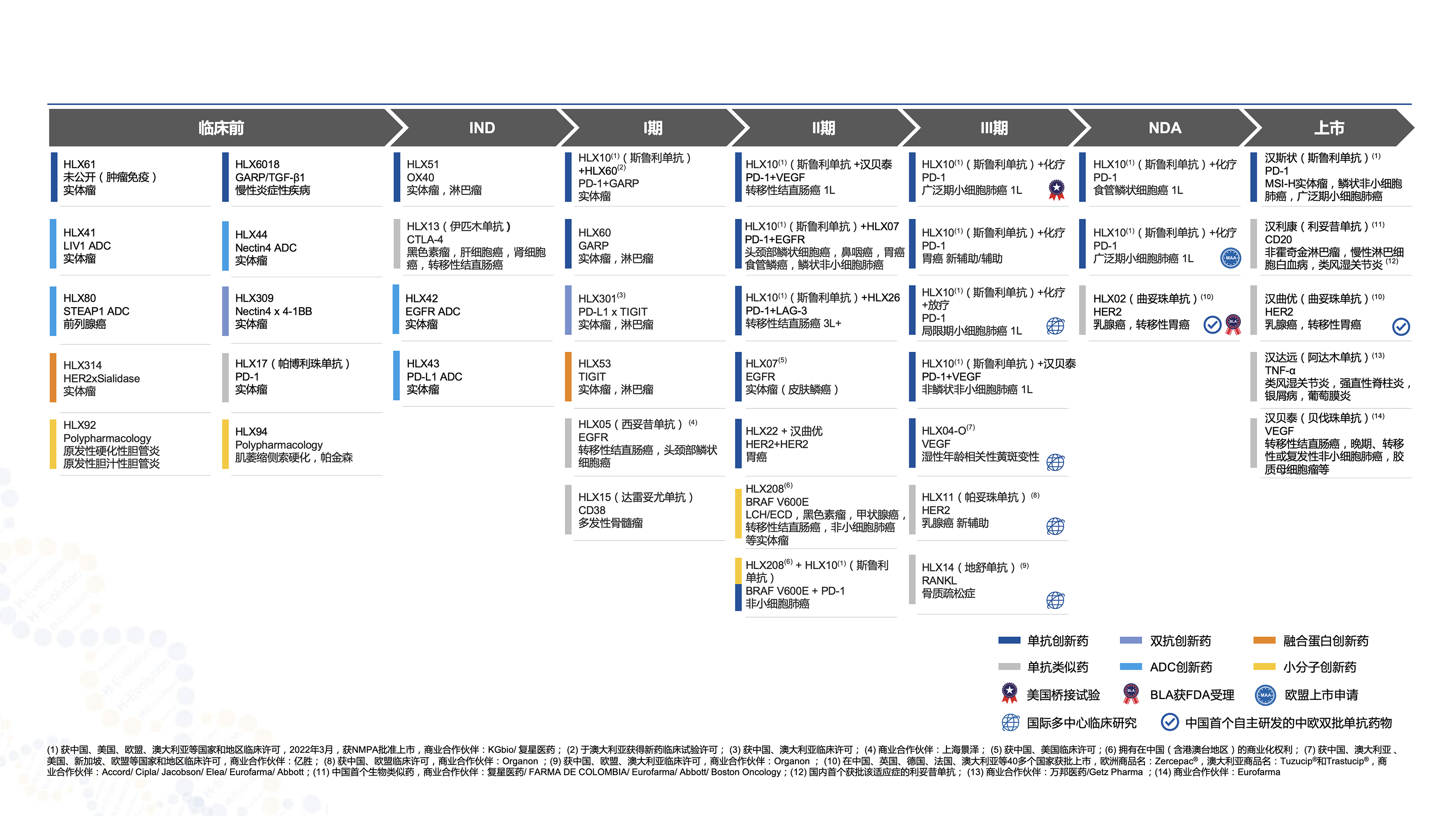 公司积极推进自主研发的HLX11(帕妥珠单抗生物类似药)、HLX14(地舒单抗生物类似药)、HLX04-O(抗VEGF单抗)的国际多中心III期临床研究。2023年上半年,HLX04-O国际多中心III期临床研究在美国完成首例患者给药。HLX208(BRAF V600E小分子抑制剂)、HLX07(抗EGFR单抗)、HLX22(抗HER2单抗)、HLX26(抗LAG-3)等多款创新产品研究结果登上国际学术舞台。此外,公司全力推进多款潜在first-in-class产品进入临床研究阶段。抗OX40抗体HLX51用于治疗晚期/转移性实体瘤和淋巴瘤的I期临床试验申请于2023年上半年获NMPA批准。2023年上半年,公司以多样化结合子偶联技术为突破点,加速推动和完善创新研发平台建设,依托自有ADC研发平台“汉联”(Hanjugator),成功推进HLX42(创新型EGFR靶向ADC)和HLX43(创新型PD-L1靶向 ADC)进入临床试验申报阶段。