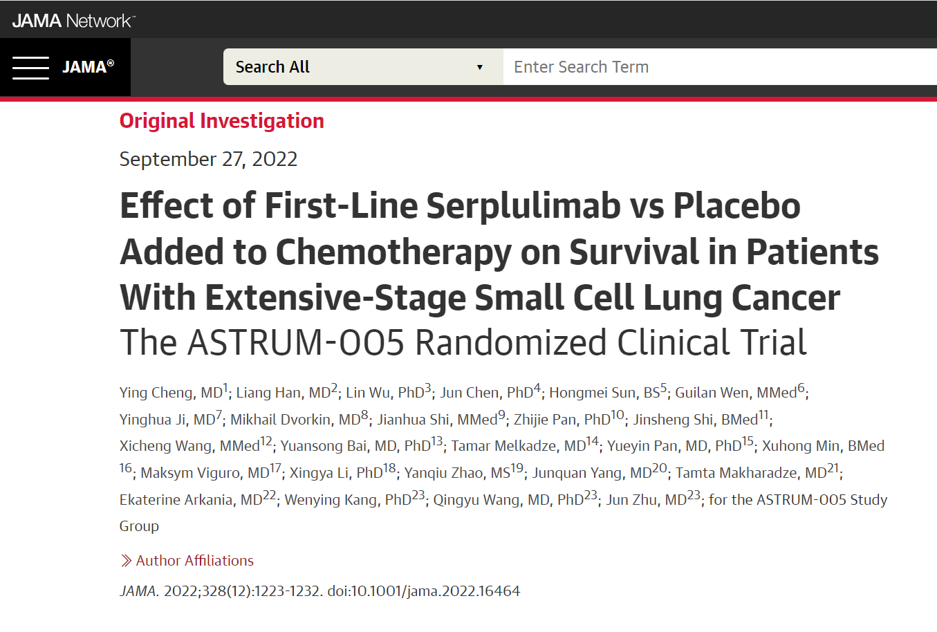 Shanghai, China, September 27th, 2022 – Shanghai Henlius Biotech, Inc. (2696.HK) announced that ASTRUM-005, an international multi-centre study led by Professor Ying Cheng, has been published in The Journal of the American Medical Association (JAMA, impact factor of 157.3), one of the top four medical journals in the world. ASTRUM-005 trial is a phase 3 study of HANSIZHUANG (serplulimab), an anti-PD-1 monoclonal antibody (mAb) developed by Henlius independently, plus chemotherapy as first-line treatment for patients with extensive-stage small cell lung cancer (ES-SCLC). After Prof. Ying Cheng orally presented them at the 2022 ASCO annual meeting, the results of ASTRUM-005 attract wide attention among the global research community. And now, ASTRUM-005 makes its way to the international arena once again, demonstrating the high level of academic acclaim on a global scale, the intelligence of Chinese researchers, and the strength of Chinese pharmaceuticals in terms of independent innovation research and clinical development.