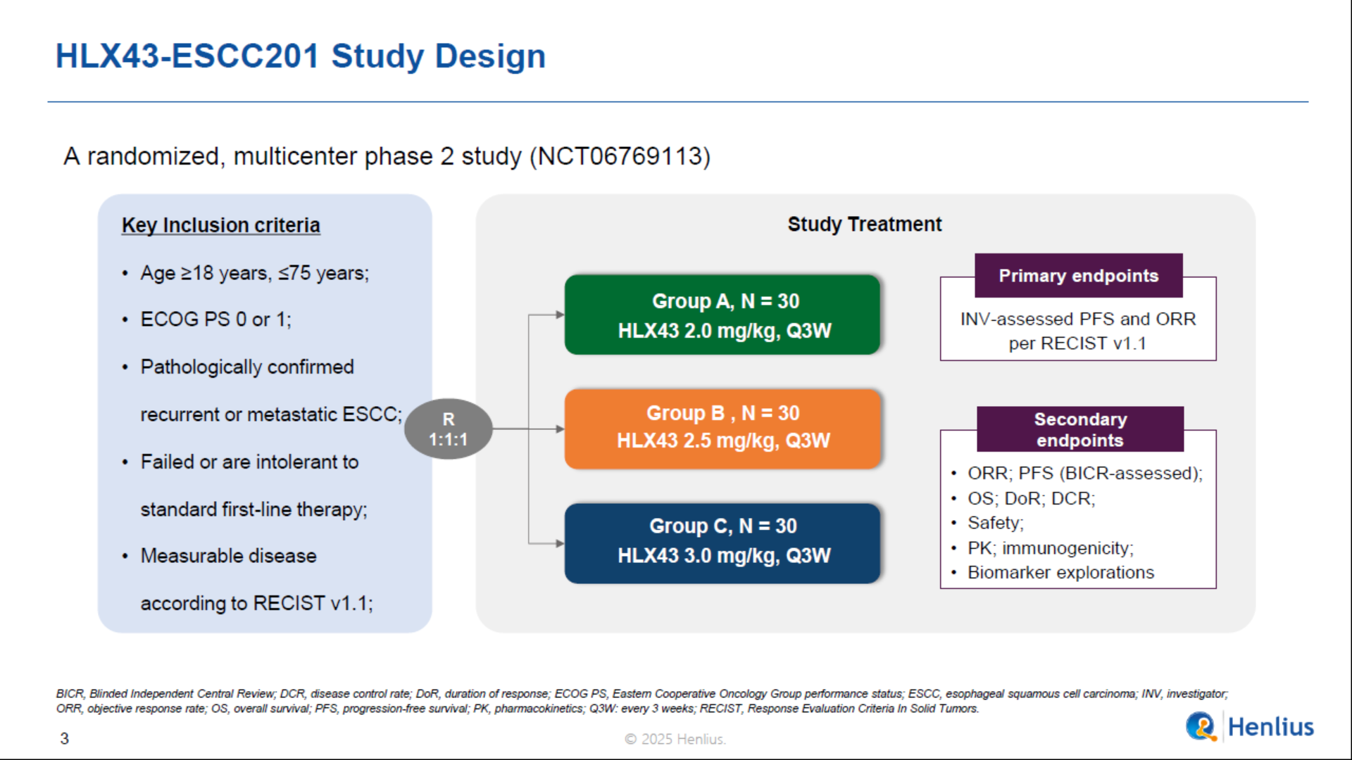 本次發佈基於一項評估 HLX43 在復發/轉移性食管鱗癌中有效性和安全性的多中心、隨機的II 期臨床研究。研究入組了經組織學或細胞學確診的復發/轉移性ESCC的患者,接受一線化免治療後進展或不耐受,並按1:1:1的比例隨機分組,接受每3周一次靜脈注射2 mg/kg、2.5 mg/kg或3 mg/kg 的HLX43。主要終點為研究者根據RECIST v1.1評估的客觀緩解率(ORR)和無進展生存期。次要終點包括其他有效性終點、安全性、藥代動力學、免疫原性和生物標誌物探索。