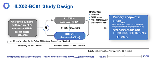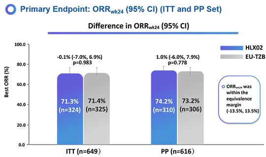 本试验入组了649例病患(HLX02,N=324;EU-TZB,N=325)。在意向性分析集中,HLX02组的ORRwk24为71.3%,原研组为71.4%,组间差异为-0.1%(95%置信区间:-7.0%,6.9%)。在符合方案集中,HLX02组的ORRwk24为74.2%,原研组为73.2%,组间差异为1%(95%置信区间:-6.0%,7.9%)。ORRwk24组间差异在预设等效区间内(±13.5%)。