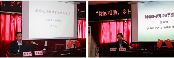 大咖来访,机会难得。面向金寨县人民医院的60余名医生和乡村医生,钱立庭教授围绕肿瘤放疗新技术及临床意义进行了详细介绍,普及了精确放疗的概念与内涵,并具体分析了质子重离子放疗和3D-CRT(三维适形放射治疗)、IMRT(调强适形放射治疗)等技术的特点和临床获益情况。潘跃银教授则围绕肿瘤治疗中的一些常见问题和临床医生常常遇到的疑惑之处进行了概念性和普及性的介绍以及实际案例分享,并对肿瘤内科主要热点和前沿进展进行了介绍。