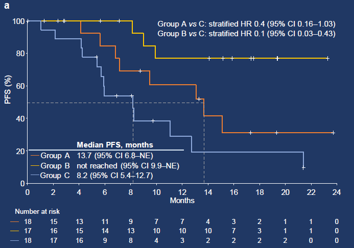 截至2024年3月25日(更新数据截止日期),53例患者被随机分配至A组(n = 18)、B组(n = 17)和C组(n = 18),中位随访时间为22.1个月。中位年龄为60岁,44(83.0%)例患者为男性,30(56.6%)例患者的 ECOG 表现状态为1。与C组(安慰剂组)相比,A组的IRRC评估的中位PFS明显更长(13.7 vs. 8.2个月;分层HR 0.40,95% CI 0.16–1.03),B组的中位PFS未达到(分层HR 0.1,95% CI 0.03–0.43)。