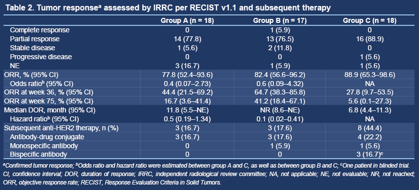 各组的IRRC评估的ORR分别为77.8%、82.4%和88.9%。各组分别有18(100.0%)例、16(94.1%)例和17(94.4%)例患者发生治疗相关不良事件(TRAE)。A组、B组和C组各有6(33.3%)例、1(5.9%)例和1(5.6%)例患者发生严重TRAE。仅C组有1(5.6%)例患者报告了5级TRAE。研究结果显示,HLX22联合HLX02及化疗在HER2阳性晚期G/GEJ癌患者中耐受性良好。