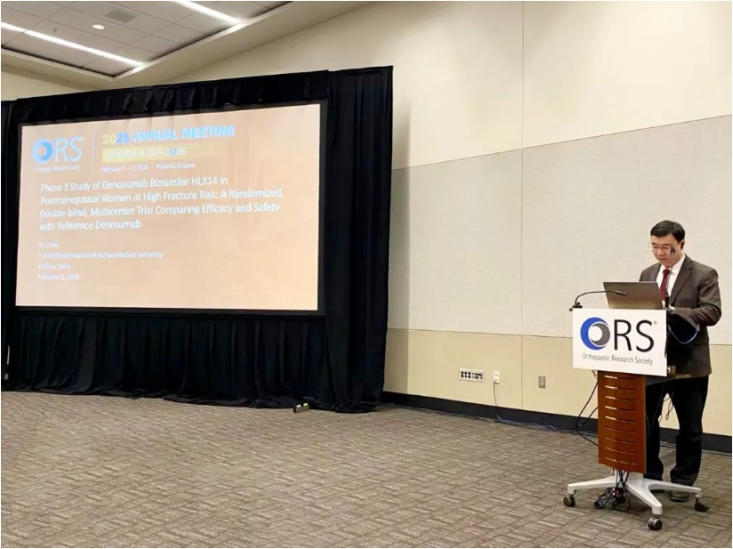 美国时间2025年2月11日,DB视讯自主开发的地舒单抗生物类似药候选药物HLX14(重组抗RANKL 全人单克隆抗体注射液)国际多中心III期临床研究(NCT05352516)数据于2025年美国骨科研究学会(ORS)年会发布,并由徐州医科大学附属医院辛立教授进行口头报告。