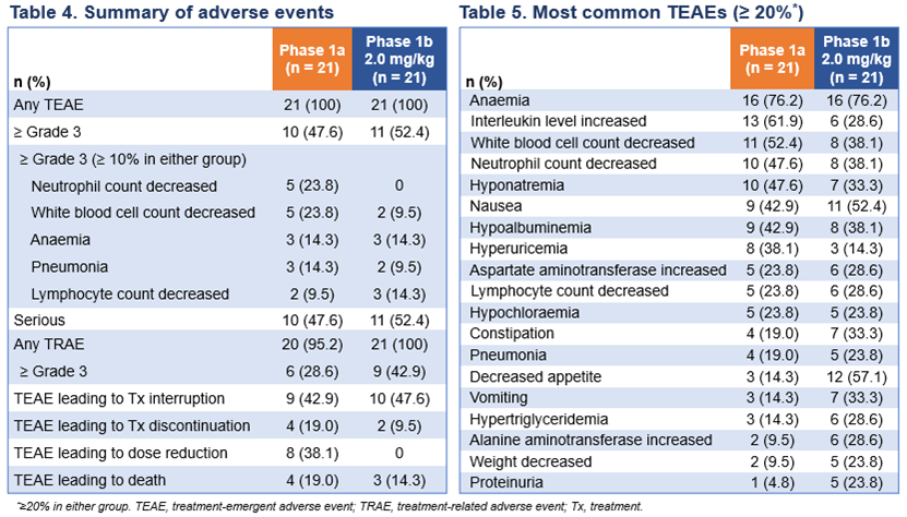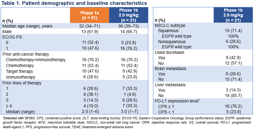 截至数据截止日期2025年3月28日,共有21名患者纳入到Ia阶段,接受剂量为0.5 mg/kg (n=3)、1 mg/kg (n=3)、2 mg/kg (n=3)、2.5 mg/kg (n=3)、3 mg/kg (n=3)或4 mg/kg (n=6)的HLX43治疗。鉴于2.5和3.0 mg/kg剂量组的患者招募仍在进行中,关于Ib期,这里仅展示2.0 mg/kg组数据。Ib期2 mg/kg组共入组21名非小细胞肺癌(NSCLC)患者(其中15名[71.4%]为鳞状,6名[28.6%]为非鳞状)。Ia期和Ib期2.0 mg/kg组的中位随访时间分别为9.7个月和7.0个月。Ia及Ib期患者的既往中位治疗线数(Median Prior lines)分别为2和3。Ib 期患者之前均接受过铂类药物治疗。