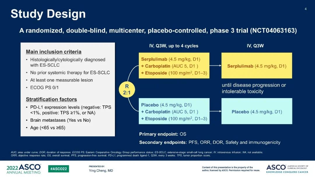 而對於外界關心的臨床試驗設計方面,朱俊解釋,ASTRUM-005研究並沒有討巧之處。在整個臨床試驗設計上,H藥的ASTRUM-005和阿替利珠單抗的IMpower133設計相差不多,包括入組病人,疾病進展之後進行免疫跨線治療等。