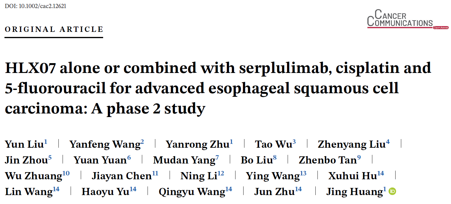 [5] Liu Y, Wang Y, Zhu Y, et al. HLX07 alone or combined with serplulimab, cisplatin and 5-fluorouracil for advanced esophageal squamous cell carcinoma: A phase 2 study. Cancer Commun (Lond). Published online October 24, 2024. doi:10.1002/cac2.12621