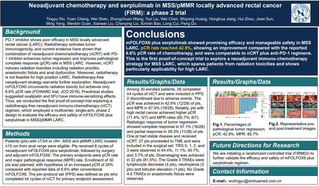 Conclusion: mFOLFOX6 plus serplulimab showed promising efficacy and manageable safety in MSS LARC. pCR rate unexpectedly reached 42.9%, showing an improvement compared with the reported 6.6% pCR rate of chemotherapy, and were comparable to nCRT plus anti-PD-1 regimens. This is the first proof of concept trial to explore a nICT strategy for MSS LARC, which spares pts from radiation toxicities and shows particularly applicability for high LARC.